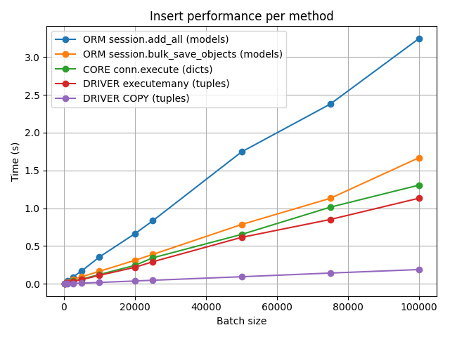 (ORM objects for ORM,dictionaries for Core, tuples for the Driver) - only the time spent moving data from Python into Postgres is measured