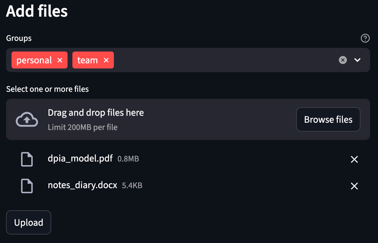 In the screenshot above the user selected two files; a PDF and a Word document, and assigns them to two groups. Behind the scenes, this is how the system processes an upload like this: