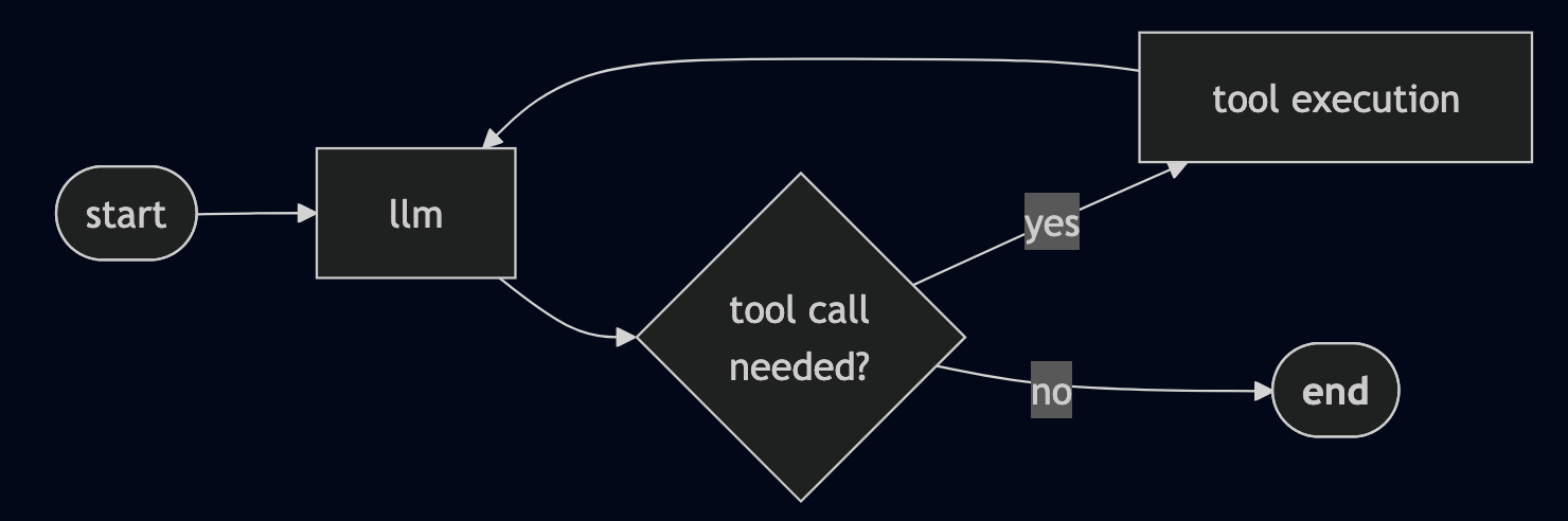 LangGraph makes it easy to define an agent: what steps it can take, how it should reason and which tool it's allowed to use. This agent can then autonomously inspect the available tools, read their descriptions and decide whether calling one of them will help answer the user's question.